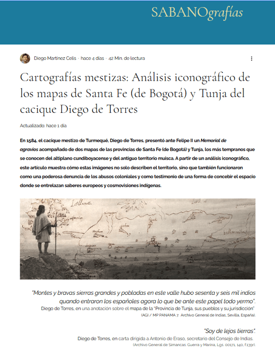 El proyecto SABANOgrafías recientemente publicó su artículo «Cartografías mestizas: Análisis iconográfico de los mapas de Santa Fe (de Bogotá) y Tunja del cacique Diego de Torres«, un exhaustivo estudio iconográfico de los dos mapas más antiguos conocidos del altiplano cundiboyacense, elaborados en 1584 por el cacique mestizo de Turmequé y adjuntados a su Memorial de agravios ante Felipe II. El artículo demuestra que, lejos de ser simples bocetos, estos documentos revelan una notable precisión en distancias y rumbos —cercana al 80 %— y recalca que funcionaron como instrumentos de denuncia política ante la Corona, visibilizando el despoblamiento indígena y los abusos del régimen colonial a través de anotaciones testimoniales sobre el territorio.