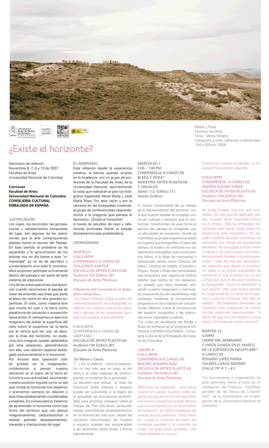 La Maestría en Artes Plásticas y Visuales de la Universidad Nacional de Colombia los invita cordialmente al Seminario: ¿Existe el Horizonte? Los dias 6, 7 , 8 y 13 de Noviembre (5 PM), en la U nacional.