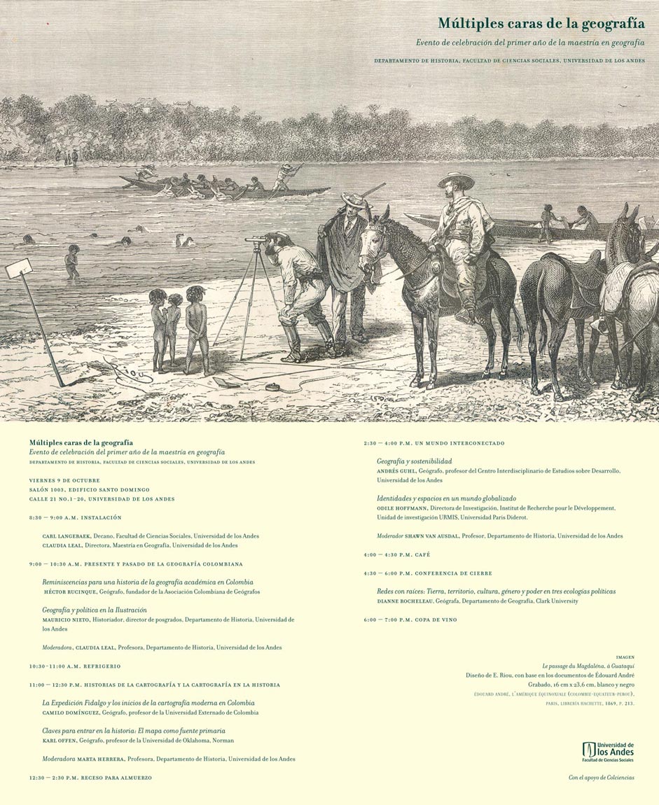 El programa incluye presentaciones de Héctor Rucinque, geógrafo, fundador de la Asociación Colombiana de Geógrafos; Mauricio Nieto, historiador, director de posgrados, Departamento de Historia, Universidad de los Andes; Camilo Domínguez, geógrafo, profesor de la Universidad Externado de Colombia; Karl Offen, geógrafo, profesor de la Universidad de Oklahoma; Andrés Guhl, geógrafo, profesor del Centro de Estudios Interdisciplinario de Estudios sobre Desarrollo, Universidad de los Andes; Odile Hoffmann, geógrafa, Directora del Centro Estudios Mexicanos y Centroamericanos, México; Dianne Rocheleau, geógrafa, Departamento de Geografía, Clark University.