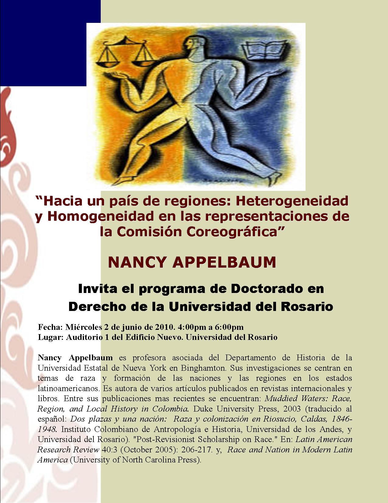 Nancy Appelbaum es profesora Asociada, Binghamton University (Universidad Estatal de Nueva York—Sede Binghamton). Actualmente se encuentra finalizando su texto Mapping the ‘Country of Regions’: The Chorographic Comission of Nineteenth-Century Colombia.