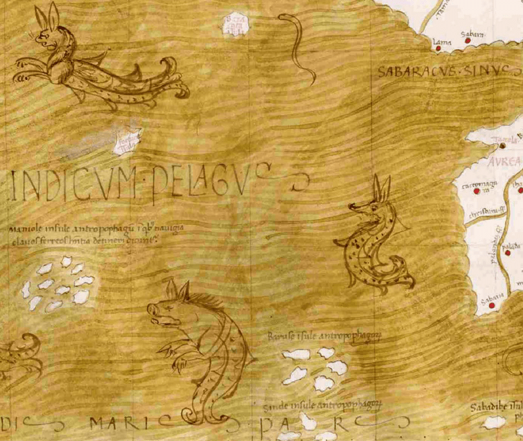 El manuscrito de la Geografía de Ptolomeo de Madrid, Biblioteca Nacional, MS Res. 255 (c. 1455 a 1460), es el único conocido que está ilustrado con monstruos marinos en sus mapas y, de hecho, contiene una de las mayores colecciones de este tipo de ilustraciones producidas en la Edad Media. Mientras que en los mapas medievales algunos monstruos marinos se derivan de los bestiarios o enciclopedias y se representan en los mapas en el lugar indicado por el texto, los de este manuscrito de Ptolomeo parecen meramente decorativos y, posiblemente, hayan sido copiados de un “model book”. El autor aborda el tema de los monstruos marinos decorativos como un elemento más en el encargo de los mapas medievales y presenta un detallado catálogo de los que aparecen en este manuscrito.