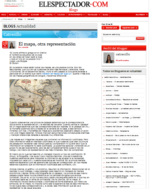 «Catrecillo», blogera del Espectador.com, publicó el 28 de junio del 2012, un post títulado «El mapa, otra representación«. Allí reflexiona sobre los mapas y otras representaciones pictóricas del mundo. «El mapa -concluye Catrecillo- es un objeto intelectual y social que responde al deseo de entender, recordar y explicar, cómo es, cómo llegar, dónde queda y a qué distancia. El mapa es un instrumento de placer que le gana la batalla al miedo ancestral de perdernos».