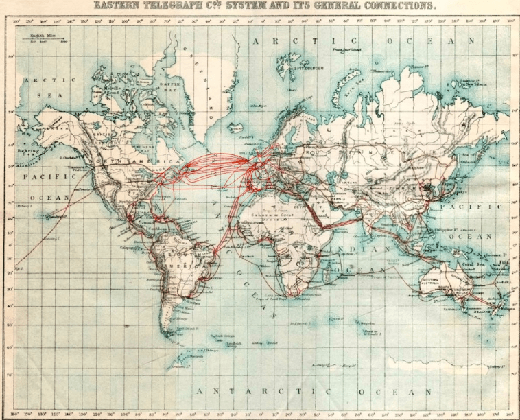 Tambien aparece un mapa mundi sobre la red telegráfica de 1901, rebautizado como «mapa del internet de 1901». No deja de ser interesante, comprobar hasta qué punto, en efecto, la infraestructura de las telecomunicaciones del siglo XXI, es heredera de la red telegráfica de finales del siglo XIX y principio del XX….