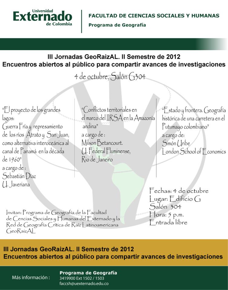III Jornadas GeoRaizAL. II Semestre del 2012. Encuentros abiertos al público para compartir avances de investigaciones. UNIVERSIDAD EXTERNADO DE COLOMBIA. Programa de Geografía