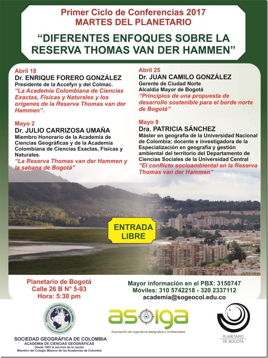 Organizan  Sociedad Geográfica de Colombia, Asociación de Ingenieros Geógrafos y Ambientales  (ASOIGA) y Planetario de Bogotá, abril 25, mayo 2 y 9 2017, 5 :30 pm. Entrada Libre.
