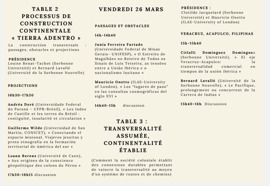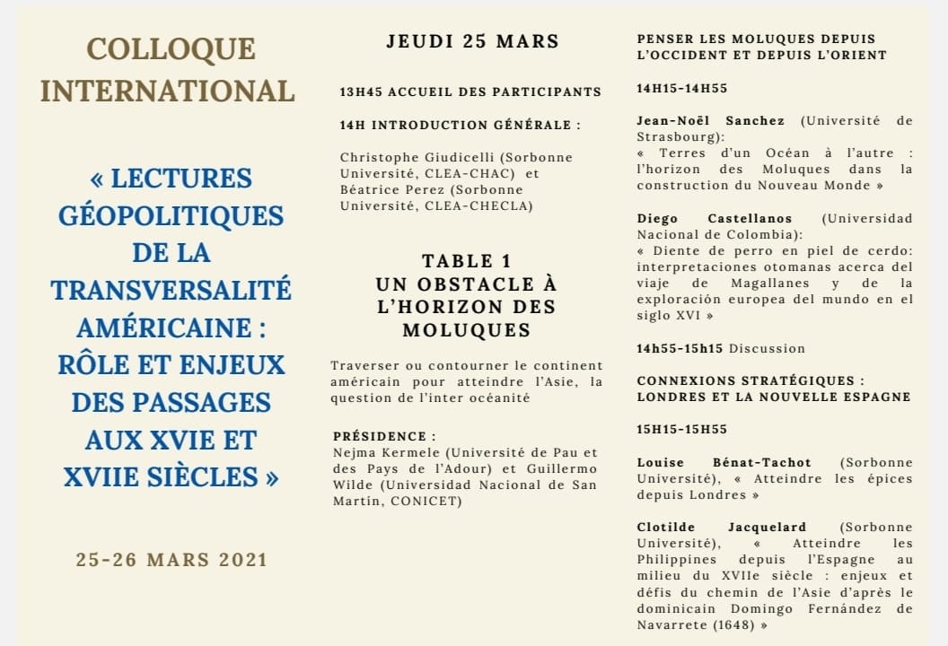 Conferencistas invitados: Bernard Lavallé, Louise Bénat-Tachot, Jean-Noël Sanchez, Diego Castellanos, Clotilde Jacquelard, Andréa Doré, Guillermo Wilde, Loann Berens, Junia Ferreira Furtado, Mauricio Onetto, Cittialli Dominguez, Paolo Vignolo, Jorge Díaz Ceballos, Sebastián Gómez, Nejma Kermele.