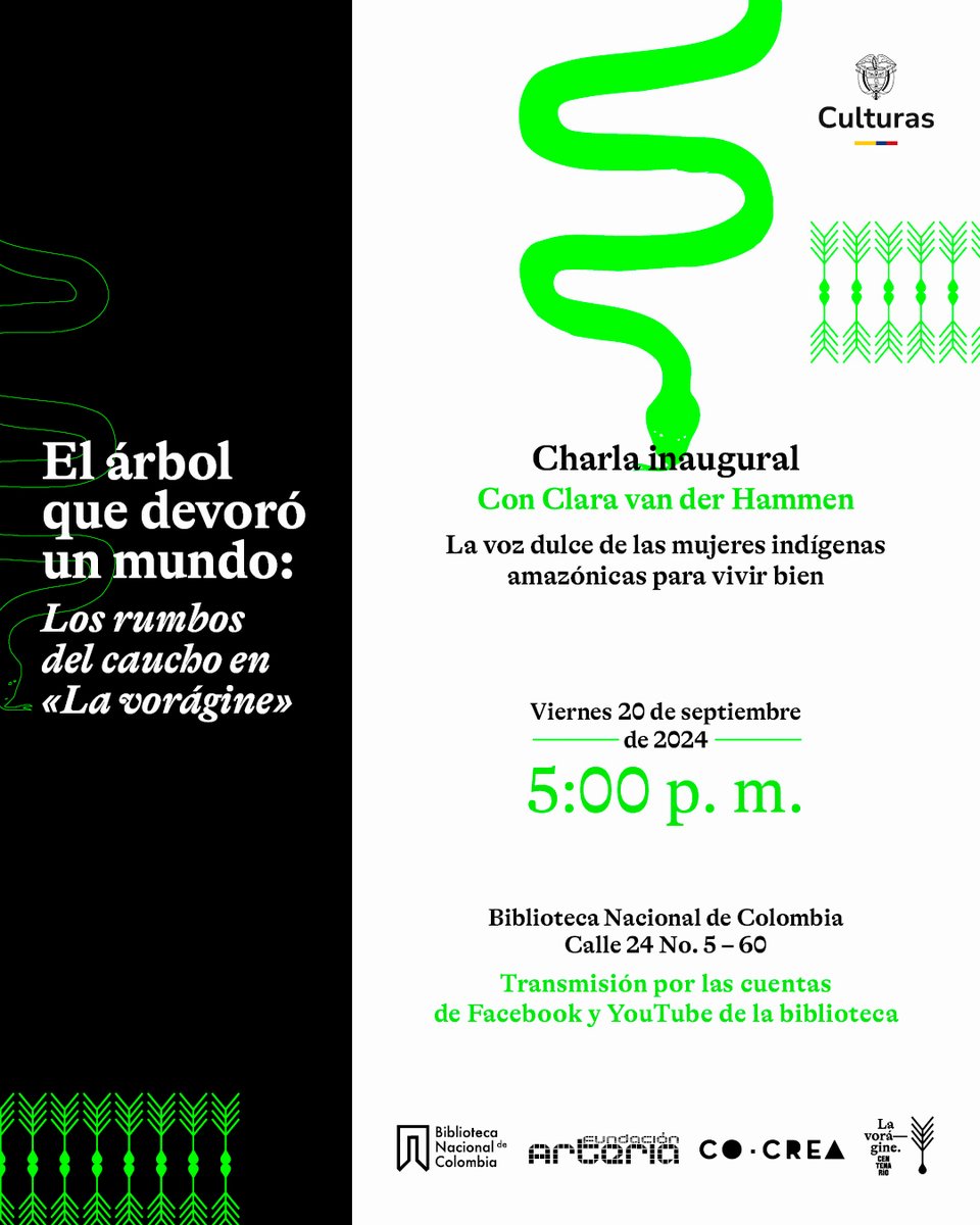 La voz dulce de las mujeres indígenas amazónicas para vivir bien. Las caucherías son solo una de las múltiples formas de violencia que han experimentado las comunidades indígenas amazónicas a lo largo de su historia. Cada auge económico y acciones como la instalación de internados han fracturado los sistemas de parentesco y las formas de asentamiento. Una consecuencia directa de estas rupturas es la violencia contra la comunidad y, especialmente, contra las mujeres. ¿De qué manera las indígenas amazónicas enfrentan esta historia y sus quiebres? En esta conferencia, que inaugura la exposición «El árbol que devoró un mundo: los rumbos del caucho en “La vorágine»», Clara van der Hammen hablará sobre cómo, a través de diversos proyectos, estas mujeres tejen relaciones entre ellas, convocan a sus familias y contrarrestan estas fracturas, apoyándose en sus saberes de las semillas, las plantas medicinales, la cocina y el cuidado en general.
