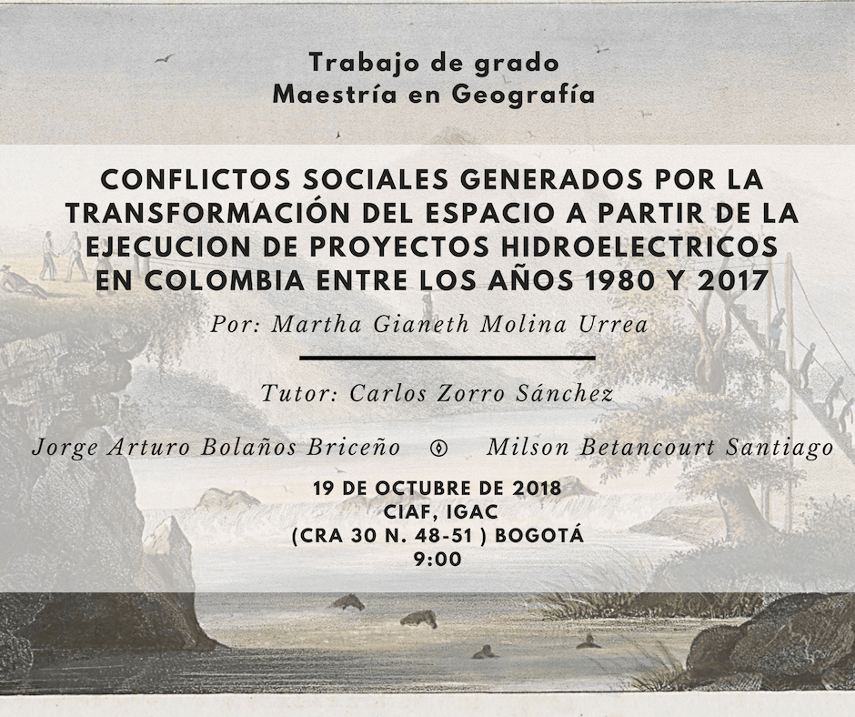 Sustentación del trabajo de grado de Martha Gianeth Molina Urrea, “CONFLICTOS SOCIALES GENERADOS POR LA TRANSFORMACIÓN DEL ESPACIO A PARTIR DE LA EJECUCIÓN DE PROYECTOS HIDROELÉCTRICOS EN COLOMBIA ENTRE LOS AÑOS 1980 Y 2017”. Director: Carlos Zorro Sánchez. Jurados: Jorge Arturo Bolaños Briceño y Milson Berley Betancourt Santiago.