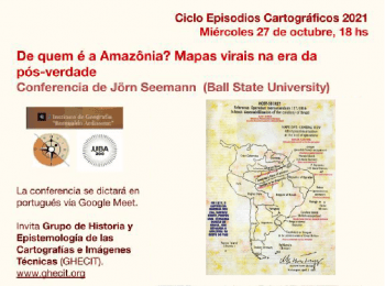 El Grupo de Historia y Epistemología de las Cartografías e Imágenes Técnicas (GHECIT) invita a una nueva conferencia del Ciclo Episodios Cartográficos, titulada «De quem é a Amazônia? Mapas virais na era da pós-verdade«. La misma estará a cargo de Jörn Seemann, y tendrá lugar el día miércoles 27 de octubre a las 6:pm Argentina (4:00 pm Colombia) a través del siguiente enlace: https://meet.google.com/rvz-khfw-zuf.