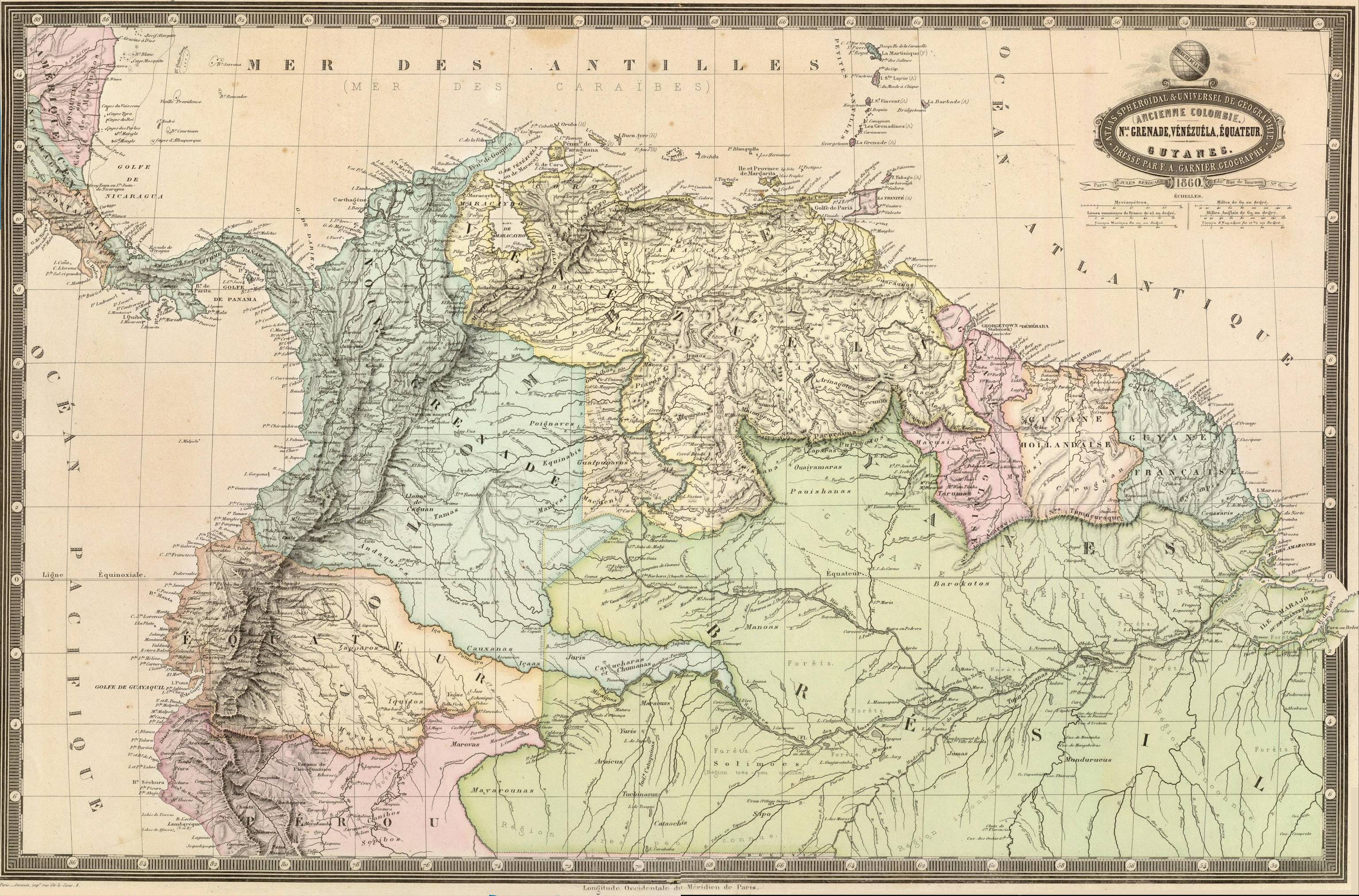 Señala algunos territorios de la amazonia y la orinoquía en disputa entre Brasil, Ecuador, Nueva Granada (actual Colombia) y Venezuela. Incluye una porción diminuta de Boliva en el borde inferior.